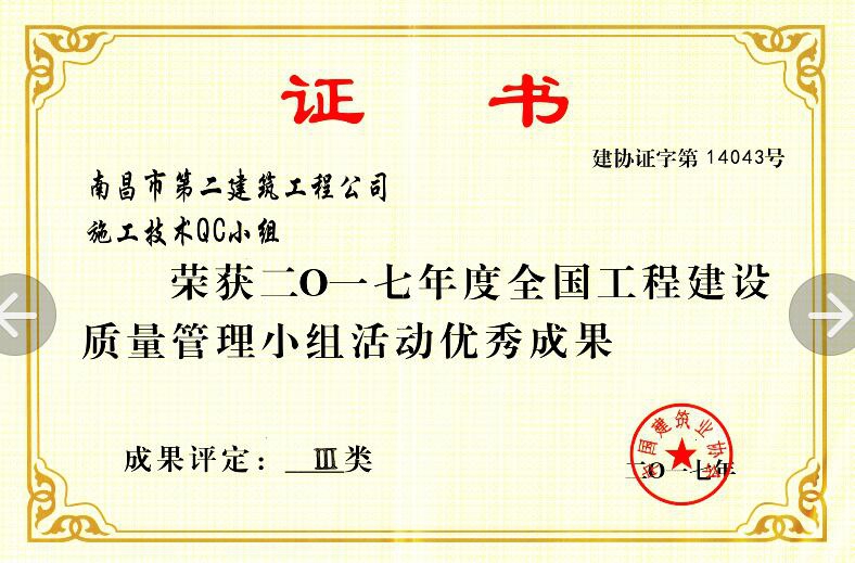 在中國建筑業協會組織的2017年度QC成果發布會上,公司QC小組的《提高GC發泡水泥保溫板外墻外保溫施工質量》成果榮獲2017年度全國工程建設質量管理小組活動優秀成果獎;付瑞平同志榮獲2017年度全國工程建設QC小組活動優秀推進者稱號。