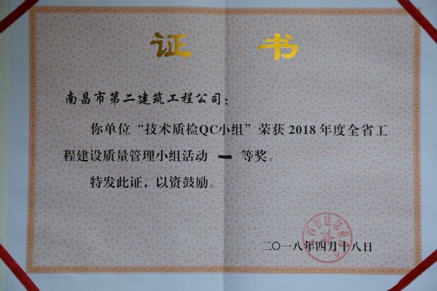 昨日,在全省QC成果發布會上,公司技術質檢QC小組榮獲2018年度全省工程建設質量管理小組活動一等獎。