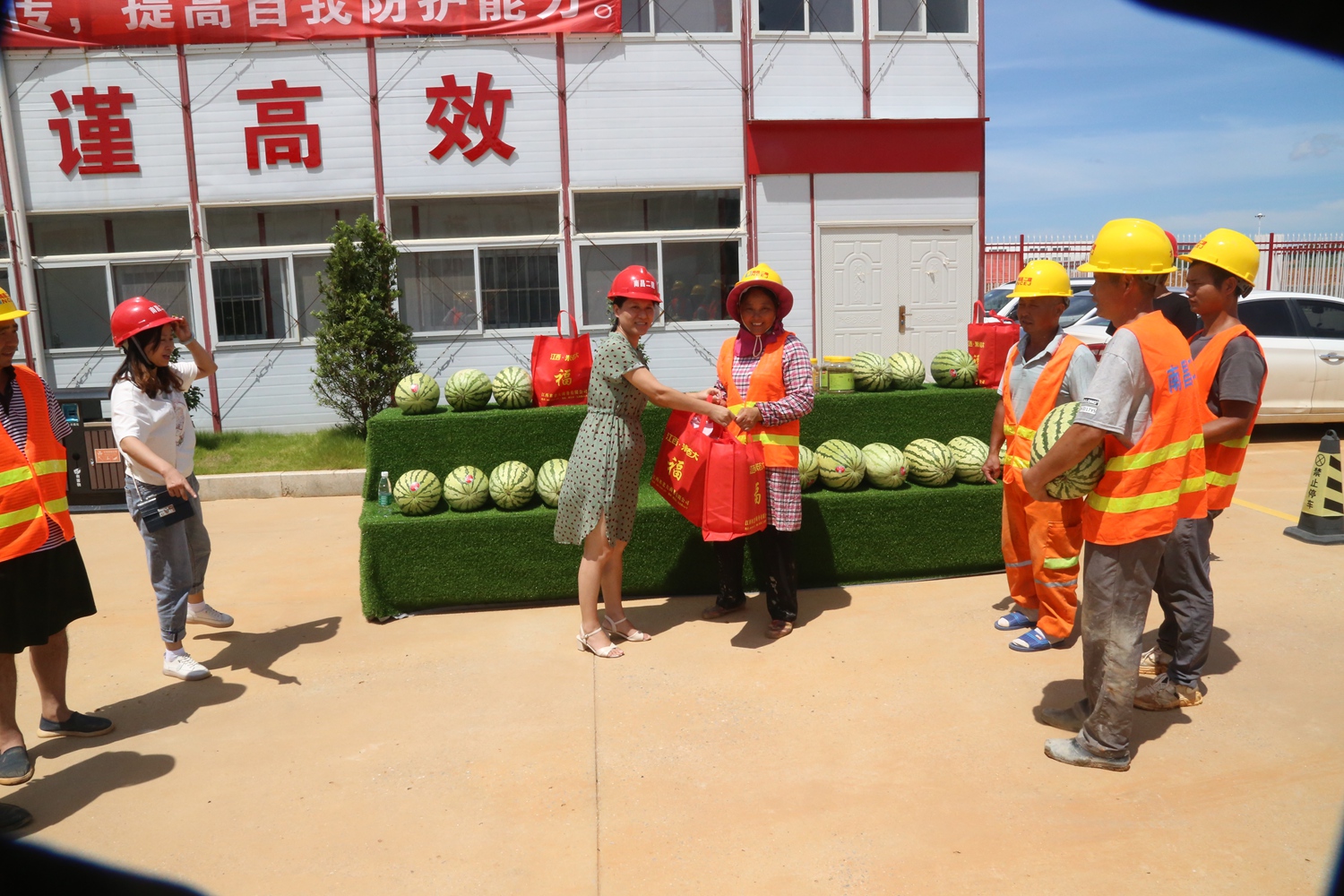 時(shí)值高溫,公司工會(huì)關(guān)心一線生產(chǎn)員工。黨委委員、工會(huì)主席付蓉一行,于8月13日、14日連續(xù)兩天,帶著防暑降溫用品,走訪了滕王閣南擴(kuò)、繩金塔民俗風(fēng)情街、南昌市第六糧庫易址重建等建設(shè)項(xiàng)目,代表公司看望慰問戰(zhàn)斗在一線的建設(shè)者們,并檢查了工地食堂、住宿等生活設(shè)施,督促項(xiàng)目部在防疫降溫的特殊時(shí)期,安全生產(chǎn),平穩(wěn)渡夏。