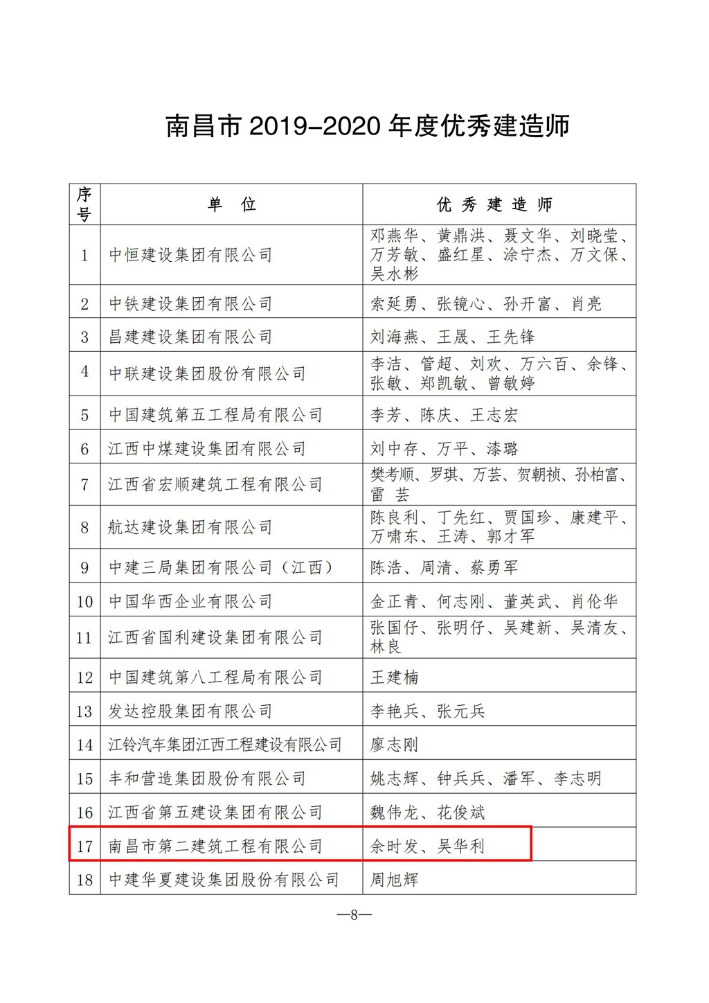 為表彰先進、樹立典型,鼓勵建筑業做大做強,著力推動我市建筑業快速健康發展,南昌市建筑業協會開展全市 2019—2020 年度南昌市建筑業先進企業和優秀建造師(監理師)評選活動。經企業申報、市建協評審、綜合市建設局相關職能部門意見,共有 82 個單位被評為南昌市建筑業先進企業 ,151 名建造師被評為南昌市建筑業優秀建造師,其中,我公司再次獲評市“先進企業”、余時發和吳華利被評為市“優秀建造師”稱號,并受到表彰。